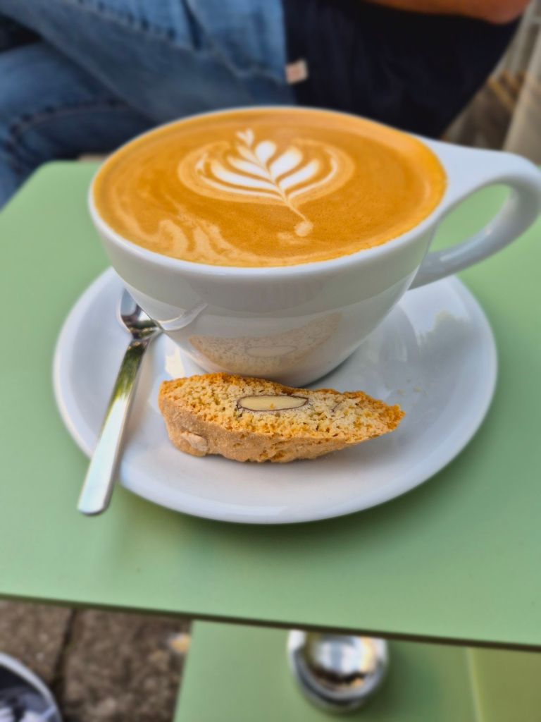 Went to a place recommended by Maria. Super strong coffee. Got chatting with the guy sitting next to me. Boeing 747 Senior First Officer with Lufthansa. His friend arrived. Airbus A320 Captain. Lots of aviation talk. Very cool meeting…
